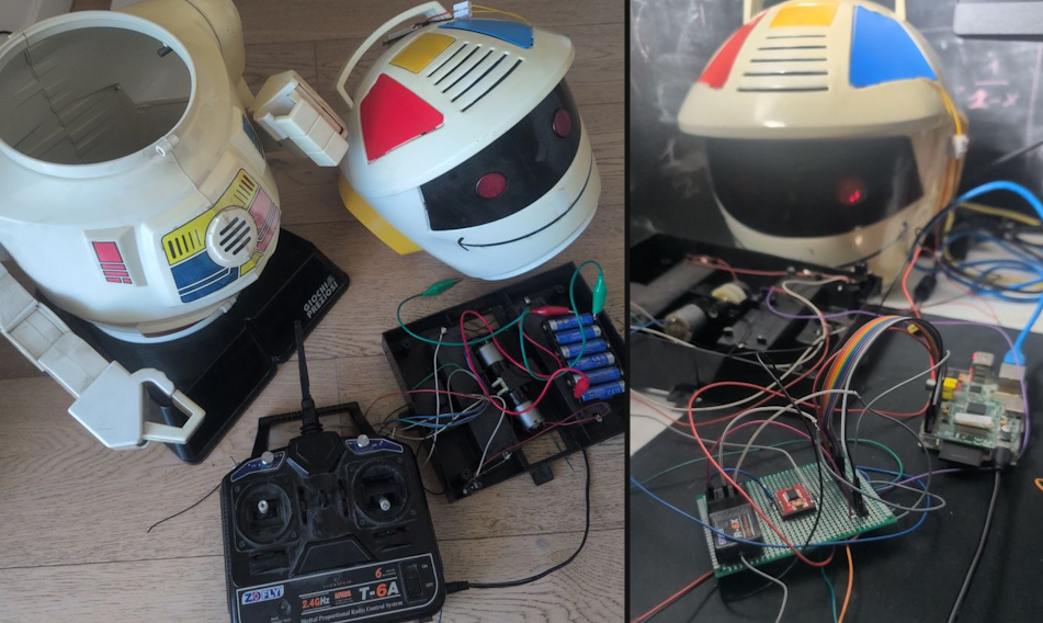 I motori ora sono alimentati da una batteria ricaricabile a 12V e il Raspberry da una powerbank, entrambi comodamente alloggiati nello zaino di Emiglio. Ho fatto anche dei fori con il Dremel sul retro di Emiglio per far uscire un Power LED, l’antenna radio, i cavi della batteria, l’interruttore della powerbank e il pulsante di spegnimento logico del Raspberry — necessario perché spegnere brutalmente l’alimentazione corrompe la SD card. I servizi tank.py e btn.py si avviano automaticamente al boot tramite systemd, così Emiglio è operativo non appena acceso, senza bisogno di un monitor o di connettersi in SSH.