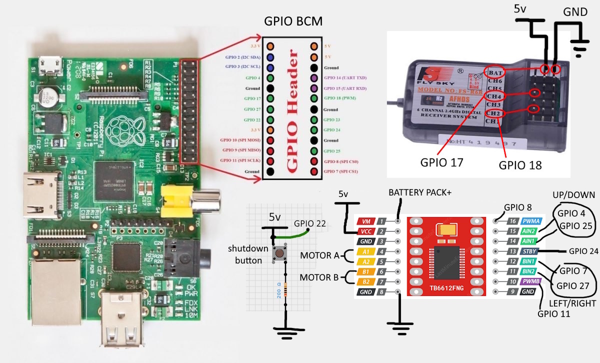 Dato che non sono in possesso del radiocomando originale mi sono arrangiato con un radiocomando 2.4Ghz per aerei. Questo tipo di radiocomando trasmette i comandi tramite segnali PWM (Pulse Width Modulation): ogni canale invia un impulso con durata variabile tra circa 1000µs e 2000µs, dove il valore centrale (~1500µs) corrisponde al punto neutro dello stick. Il ricevitore radio viene collegato direttamente ai pin GPIO del Raspberry Pi 1 B. Per leggere questi segnali con precisione ho usato la libreria pigpio, che permette di misurare la durata degli impulsi in modo hardware-accurato senza dipendere dai tempi del sistema operativo. Il driver TB6612FNG si occupa di pilotare i 4 motori DC ricevendo i segnali di direzione e PWM dai GPIO del Raspberry tramite lo script tank.py, che implementa una logica di movimento a carri armati: le ruote dei due lati vengono gestite indipendentemente per permettere le svolte.